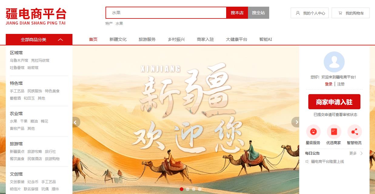 这种设计将购物转化为文化之旅,激发用户亲临新疆的向往,形成“线上观景—线下体验—购物回味”的完整链条,让每一次消费都成为对新疆文化的深度探索。为多方位展现新疆魅力,平台设立多元板块,诚邀商家共拓商机:特产专区严选阿克苏苹果、和田核桃等优良农产品,确保新鲜直达;文旅板块整合自然风光与人文体验,推出特色线路;服饰频道展示传统艾德莱斯绸与现代设计,传递新疆时尚;音乐专栏挖掘本土旋律,为音乐人提供展示舞台.