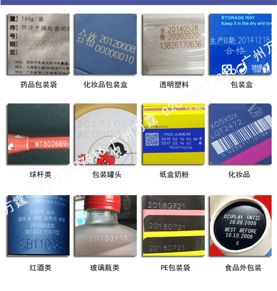 激光喷码作为一种先进的激光加工工艺,目前,已被广泛应用于日化、食品、药品等各行业之中。和喷墨标记这种物理喷涂不同,激光喷码过程中,是激光光束和材料表面发生反应,从而产生标记。因此激光对于不同的材料的作用效果有所不同,而不同型号的激光喷码机应用范围自然也不相同。而其中万霆CO2激光打标机的应用范围广,适用于各种非金属和金属材料,对于木材、布料、塑料、纸质、玻璃等大部分的非金属材料,以及喷漆金属包装材料喷码有着一定的优势。