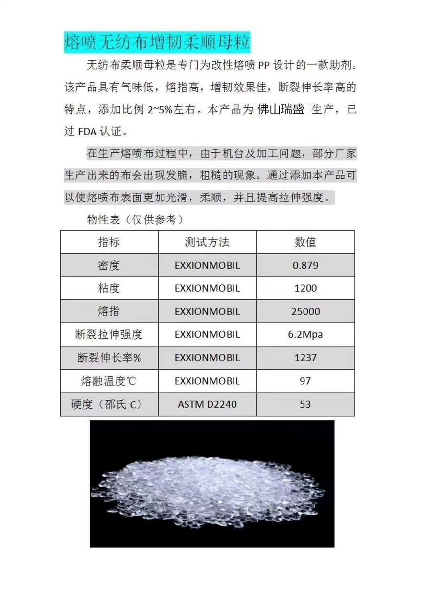 熔喷料 无纺布料中添加可以提高材料的可纺性,可纺性随着含量的增加而提高.非织造材料体现出高强和高柔韧性,可广泛应用于包装和医卫产品领域.