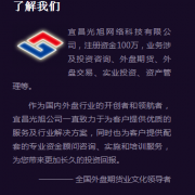 宜昌光旭网络科技有限公司,注册资金100万,业务涉及投资咨询、外盘期货、外盘交易、实业投资、资产管理等。