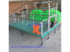 8.母猪定位架的作用是控制母猪自由活动区域和躺卧方式,母猪产床定位架之间有挡杠,避免仔猪被压死、踩死和压伤。定位架的长度一般为2.1-2.3米,宽度为0.6米,高度为1.0米。限位架下边的一根栏杆上面焊有弯曲的档柱,用以保护仔猪,而不影响仔猪吃奶。