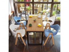 4,产品材质:防火板桌面,铸铁台脚或不绣钢台脚,曲木椅子,不绣钢椅架。