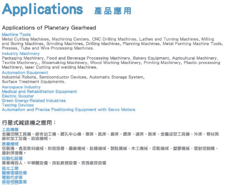 行星减速机能配合各种*的伺服、步进、直流马达等传动系统,可降低转速,提高输出扭矩和降低负载惯量,将动力完整的传输至应用端,具备体积小、精度高、低背隙、*率、高输出转速、高输出扭矩、运转平顺及低噪音等特性,适用于工具机械、包装机械、产业机器人、半导体设备、航太工业、医疗设备及检验测试仪器等等各种精密自动化机器设备中。