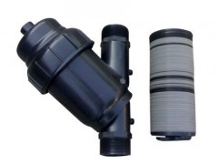 离心式过滤器是由高速水流产生的离心力将沙粒和其他较重的杂质从水体中分离出来,主要用于含砂水流的初级过滤。它采用钢板焊接而成,由两部分组成;上部分为离心壳体,下部分为沙石罐。对大于200目的砂粒杂质,分离效果可达95%左右,水头损失在3.5-7.7m范围内。若水流中含有机物或比水轻的杂质,则分离效果很差。在水流不稳定的状态,即开泵与停泵期间由于水流不稳定,则过滤效果不好,因此一般与网式过滤器组合使用。