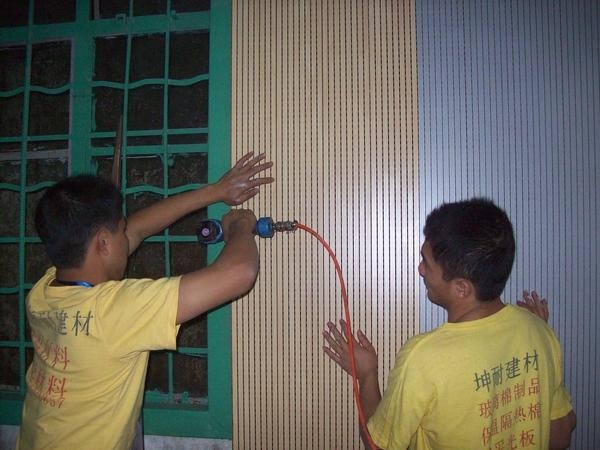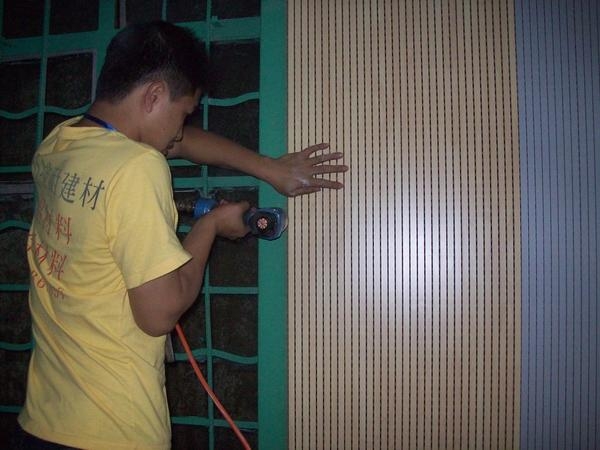 用扣片锁紧,一块接一块再将其他吸音板安装上去。注:为了简化安装方法,装上木质龙骨后,可将吸音板直接用枪钉