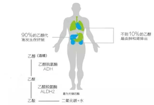 从胃肠吸收进入血液内的酒精,主要在肝脏进行过滤和代谢,未能及时分解的酒精会随着血液到达心脏,流经肺部,再从肺又返回到心脏,然后随着血液循环走遍全身。肝脏处理酒精的能力越强,血液中酒精的浓度越低,对人体的伤害越小。