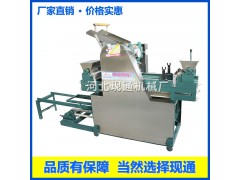 (5) 调试滚筒前先把调整滚筒的手柄调到*紧,做上记号,同时松手柄,这样厚薄就会一致。然后把和好的面絮放在进料口,不要用手指向滚筒里推面,要用掌心,避免把手指压近滚筒造成伤害,根据您的需要反复把面皮压成形,再用木轴卷起来,然后放到机器的进料口,把滚筒调试您需要的厚度,就可做出光滑的面皮,再经过输送带传送,打开粉箱离合器自动撒上淀粉或面粉,有输送带把撒完粉的面皮自动带到折叠的机架上,由自动折叠装置自动把面皮折叠起来。做饺子皮用模具扣,做馄饨皮用刀切,装上面条刀可做出粗细不等的鲜面条。