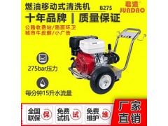 君道B275汽油高压清洗机,采用本田汽油发动机驱动,配备三缸陶瓷柱塞增压泵,工作压力可调,压力可达275公斤,使用寿命超长,本产品适合缺乏电源的地方工作。动力单元可加注92号汽油节能*,水流冲洗形状可变成直线或扇面形状清洗,配有4种钢制快捷清洗喷嘴,便于多种清洗工况要求,装有2个大轮胎自身移动轻便,也和装固在三轮车、电瓶车、或汽车上更便与长距离移动清洗,该机型上市进10年来,多用于矿山石、高速公路、机场跑道、收费站及城市市容环卫保洁清洗,因此也称小广告清洗机、清洗机等,是真正意义上的移动式清洗设备。
