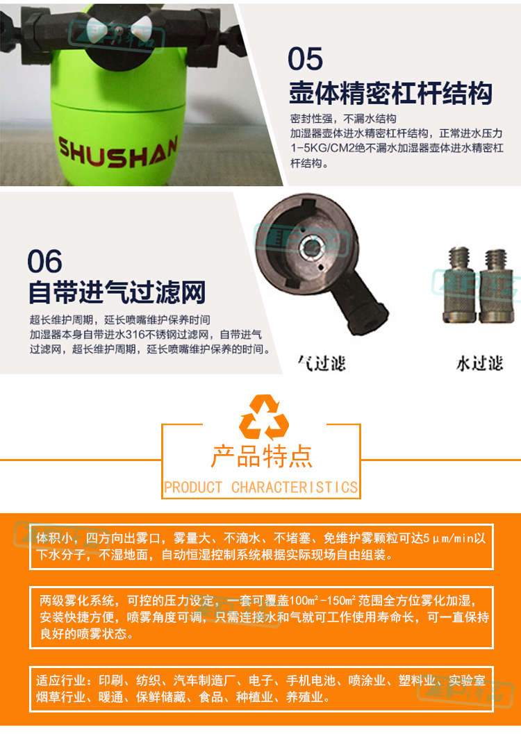目前,国内电子厂房越来越严格,为了保证产品的出厂品质,用户必须对生产厂房的温湿度进行严格的控制,尤其是湿度,如果过于干燥则厂房内极易产生静电,造成 CMOS 集成电路损坏(注:试验表明,相对湿度为 20 % RH 时,厂房内静电电压为 10000V ,相对湿度低到 10 %时,厂房内极易产生 20000V 的电压),此外,过于干燥的空气也会造成空气中粉尘飞扬,诱发呼吸道疾病,影响工人的身心健康,降低工作效率!一般来说,电子厂房的温度控制在 22 ℃ 左右,相对湿度控制在 40 ~ 60%RH 之间,在这种环境下,人们感觉舒适,静电也消失了!