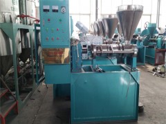 榨油机运转时,经过处理好的油料从料斗进入榨膛。由榨螺旋转使料胚不断向里推进,进行压榨。由于料胚在榨油机的榨膛内是在运动状态下进行的,在榨膛高压的条件下,料胚和榨螺、料胚和榨膛之间产生了很大的摩擦阻力,这样能使料胚微料之间产生摩擦,造成相对运动。另一方面,由于榨螺的根园直径是逐渐增粗,螺距是逐渐减少的,因而当榨螺转动时,螺纹使劲料胚即能向前推进,又能向外翻转,同时靠近榨螺螺纹表面的料层还随着榨轴转动。这样在榨膛内的每个料胚微粒都不是等速度,同方向运动,而是在微粒之间也存在着相对运动。由摩擦产生的热量又满足了榨油工艺操作上所必须的热量,有助于促使料胚中蛋白质热变性,破坏了胶体,增加了塑性,同时也降低了有的粘性容易析出油来,因而提高了榨油机的出油率,使有料中的油压榨出来,并从园排缝隙和条排缝隙流出。