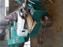 榨油机运转时,经过处理好的油料从料斗进入榨膛。由榨螺旋转使料胚不断向里推进,进行压榨。由于料胚在榨油机的榨膛内是在运动状态下进行的,在榨膛高压的条件下,料胚和榨螺、料胚和榨膛之间产生了很大的摩擦阻力,这样能使料胚微料之间产生摩擦,造成相对运动。另一方面,由于榨螺的根园直径是逐渐增粗,螺距是逐渐减少的,因而当榨螺转动时,螺纹使劲料胚即能向前推进,又能向外翻转,同时靠近榨螺螺纹表面的料层还随着榨轴转动。这样在榨膛内的每个料胚微粒都不是等速度,同方向运动,而是在微粒之间也存在着相对运动。由摩擦产生的热量又满足了榨油工艺操作上所必须的热量,有助于促使料胚中蛋白质热变性,破坏了胶体,增加了塑性,同时也降低了有的粘性容易析出油来,因而提高了榨油机的出油率,使有料中的油压榨出来,并从园排缝隙和条排缝隙流出。