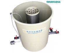 鱼苗孵化桶采用上大下小的漏斗状设计。进水口在下面,便于将可能粘连在一起的鱼卵冲散。同时可以将高溶氧的水扩散。保证孵化过程中对溶氧的需求。进水口装有阀门以控制流量,以免流量过大对鱼卵造成冲击损伤。出水口在上面,而且设计成一个环状的槽形,可以在内环上安装上一个滤网,防止鱼卵被冲入出水口。