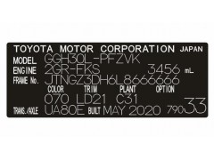 进口丰田汽车铭牌早期是使用金属铭牌和金属VIN码标签,近年来逐步更换为柔性防伪易碎属性的汽车柔性出厂铭牌标签、柔性VIN码标签产品,全车多出需要使用汽车柔性出厂铭牌、VIN条码等标识。是具体车型、原产地、改装厂、进口途径等的不同,常见的铭牌型式有:丰田汽车英文铭牌、丰田汽车阿拉伯文铭牌、丰田汽车中文铭牌、平行进口汽车丰田铭牌等;平行进口车辆上,往往会出现多个铭牌的情形,比如:美规丰田汽车,进入国内市场可能会有一个原厂英文铭牌和一个改装厂中文出厂铭牌;中东版丰田汽车,进入国内市场可能会有一个阿拉伯文铭牌和改装厂中文铭牌标识。