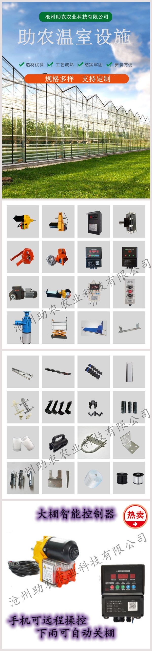 生产、销售温室大棚配件电动卷膜器,手动卷膜器,卷帘机,大棚骨架,智能放风系统,电动卷膜器电源开关,爬升器,遮阳系统,保温被,卷帘机,开窗电机,拉幕电机,防虫网,温室智能升降采摘车、大棚轨道运输车、温室周转采收车、轨道零部件等设施农业装备