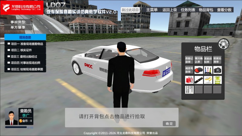 本软件主要根据大型保险公司对汽车保险理赔流程中的查勘环节进行模拟设计,引入保险服务企业17种具有典型教学意义的案例。针对查勘准备,现场查勘,查勘处理三个重要环节,我们以查勘员岗位职责为依据,综合了大量的车险查勘经典案例,将一个查勘员必备的理论知识、工作能力、查勘技巧等以三维仿真软件交互的方式展现出来。