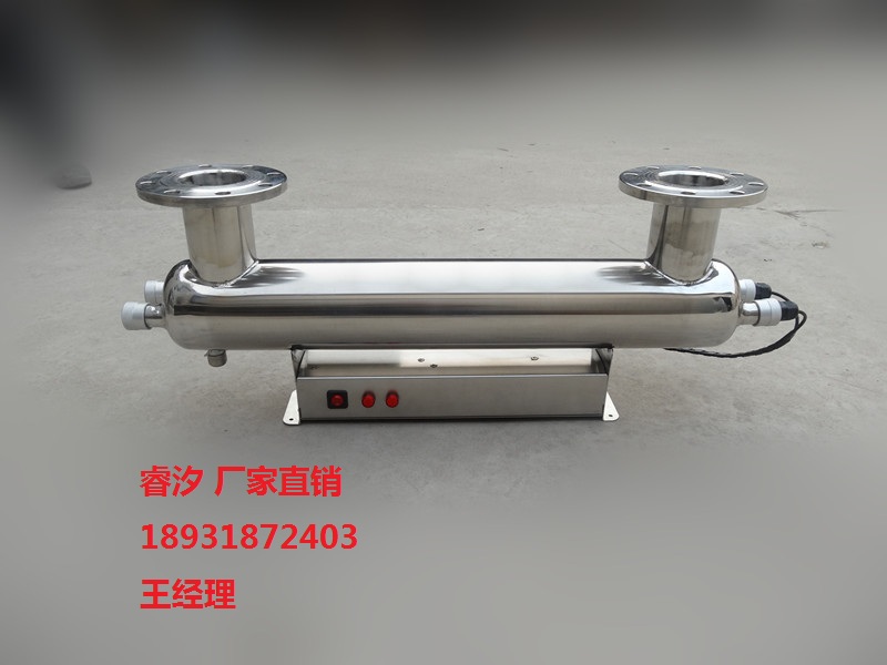 紫外线消毒器为管道式,采用世界水平的高强度无臭紫外线灯,内壁经过特殊处理的食品级三零四不锈钢,使经过预处理的水流过筒体时受到波长254nm紫外线足够量的照射,具有良好的杀菌效果,由于他不改变水的物理、化学性质,所以在二次供水、食品、饮料、化工、电子、医药、污水、中水是不可缺少