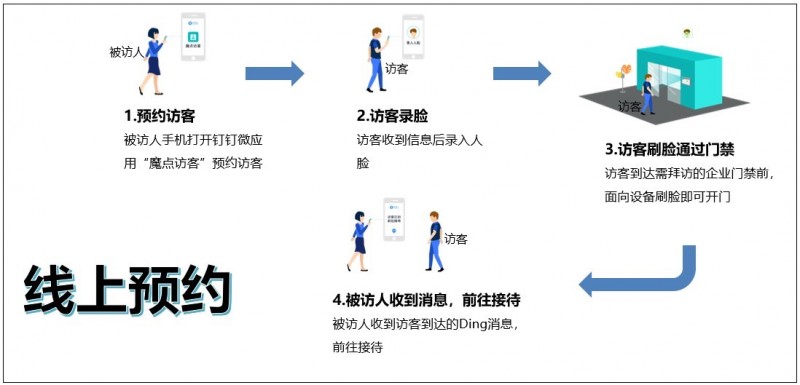 人脸识别访客管理系统,以人脸识别设备作为识别终端,整合小程序、钉钉、APP实现了,访客从预约来访、来访审批、到访认证、到访统计的全流程信息化。人脸识别访客管理系统的主要功能如下。