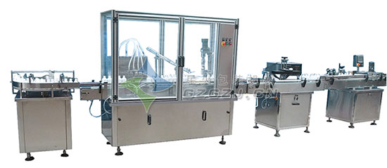 糖浆口服液灌装旋盖联动线适用于适用于批量生产各种液体灌装的产品,并能自动上塞,上盖,旋盖及贴标。