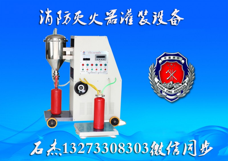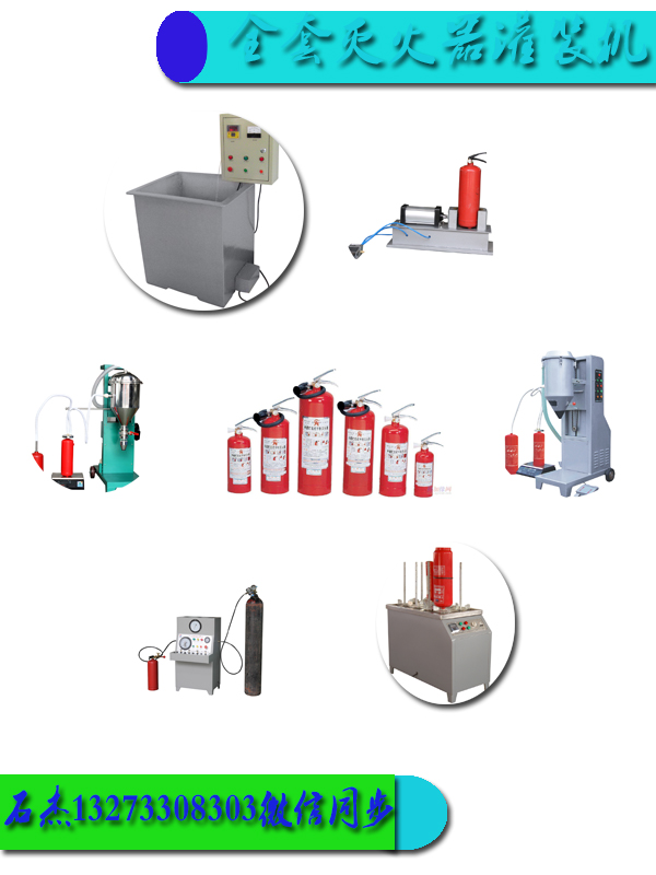 手提灭火器充气灌粉装置,包括充气头、底板和充气平台,充气头上设置有压力表。充气头上接有气管,气管上连接有脚踏阀门开关,然后与气瓶等的气源相接,安全箱体上部的板面为所述的充气平台,安全箱体开设有安全门,安全门上设有插销,对应的安全箱体的门边上设有插孔。安全箱体的上部为充气平台,和图开设有充气缺口,充气头设在充气缺口的一侧,充气缺口另外一侧焊接有卡口。充气头的另一端设有推进装置,推进装置包括偏心轮和工作手柄,偏心轮用销轴销在安全箱体的上部的充气平台上,工作手柄固定在偏心轮上,充气头的进气口接有内接头,内接头穿过充气平台,内接头连接有复位弹簧。底板设在安全箱体内,底板连接有升降装置。通过升降装置,底板可以升降,升降装置包括带手柄的升降螺杆和滑杆,底板上设有升降螺母,升降螺杆上设有平面轴承,升降螺杆穿过安全箱体上部的板面,平面轴承位于安全箱体上部的板面上,升降螺杆下端旋在升降螺母上;滑杆左右各一根,滑杆上端固定在安全箱体上部的板面,下端穿过底板。