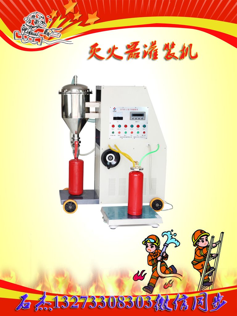 灭火器灌装机滑杆的作用为底板的轨道,升降螺杆为丝杆结构,通过手柄的转动,可以控制底板的升降。在安全箱体的另一侧设有拆卸箱体,拆卸箱体上设有灭火器拆卸装置。灭火器拆卸装置包括夹具和带手轮的螺杆,夹具包括定夹板和滑动夹板,定夹板和滑动夹板上设有V字口,相互对应,V字口上附有橡胶板,拆卸箱体上部两侧设有导轨,导轨为槽钢,定夹板固定在拆卸箱体上部,滑动夹板两侧位于导轨内,拆卸箱体上设有螺母,螺杆旋进螺母,螺杆的末端和滑动夹板后部连接。通过手轮转动,带动螺杆转动,滑动夹板可在导轨里移动,控制定夹板和滑动夹板的V字口距离。对灭火器进行充气时,调节底板,进行升降,通过手柄的转动控制底板的高度,适合相应的灭火器。把灭火器放在底板上,灭火器的机头一端靠在充气缺口处的卡口上,关上安全门,安全门通过插销和插孔安全关闭,充气头对准灭火器机头的充气孔,转动工作手柄,偏心轮同时转动,偏心轮会顶压在充气头后端部,充气头往充气缺口推进,可以实现充气头往灭火器机头推进。用脚踩脚踏阀门开关,可以实现供气,操作人员通过观察充气头上的压力表,来判断其充气是否已经完成。当压力表达到规定的气压值时,充气完成。脚离开踏阀门开关,工作手柄反转,偏心轮会脱离充气头后端部,充气头通过复位弹簧复位,这和现有的技术相同,通过复位弹簧使得充气头复位,充气头离开灭火器机头,可以打开安全门,把灭火器取出,充气完成。