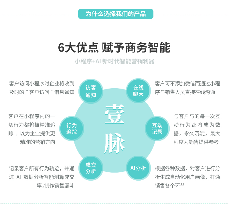 壹脉智能名片是成都壹立科技有限公司旗下的一套智能商务系统;为企业打造一套智能化的商务体系,重新定义销售,帮助您的企业获客;基于小程序+AI技术开发的人工智能名片和AI雷达系统,通过微信的连接能力和开放能力将公司官微、公司产品、客户雷达系统、智能CRM客服系统有机组合,打造成新时代智能营销利器。 一、智能名片-个性化名片智能创建,迅速打造形象门户 融汇名片、官微、商城、动态*信息 · 以文字、图片或视频形式实现多维度曝光 · 客户只需要扫一个小程序码 · 即可全面了解产品服务信息、 二、产品商城-线上专属商城轻松打造,电商模式瞬间开启 · 任意商品手动添加、自主排序,秒级触达客户 · 同时解决传统电商平台流量无法变现的问题 · 让流量从获取到传递到变现,形成营销闭环 三、企业官微-企业信息全面展现,*形象统一输出 公司历程、新闻动态、招聘信息一键发出 · 企业实力及荣誉,发展动向及动态全面了解 · 所有客户皆可在*时间获取信息 · 只有企业想不到的,没有客户看不到的 四、IM在线聊天-IM聊天在线沟通,不加微信也能*撩客 · 壹脉黑科技让访客瞬间变客户 · 在小程序内可以主动和访客实时聊天 · 客户离线时消息便以“服务通知”触达客户 · 不加微信也能建立起*沟通及跟进的渠道 五、雷达系统-24小时不间断客户追踪,快速锁定意向客户 · 追踪用户行为轨迹,根据客户画像自动化分析 · 标签化管理客户,为销售提供精准的营销方向 · 强大AI统计分析打通销售各个环节 · 科学分类客户,全面满足销售需求 六、互动营销-多级分销,人人营销打造超强战队 · 分享,真正实现人人皆营销 · 支持多种分享模式发展、巩固分销链 · 以分销佣金吸引用户转发分享 · 让人脉变钱脉,真正实现全员营销 七、AI分析-标签化管理客户,撩客稳准狠 · 根据用户访问轨迹,科学分类客户 · 并有效判定客户的喜好与被吸引点 · 根据其访问频率与模块区域有效跟进 · 撩客稳、准、狠,成单快、易、猛! 八、分享裂变-基于超10亿用户池,实现病毒式裂变 · 以小程序为入口,基于微信超10亿活跃用户量 · 名片可通过转发好友、微信群、朋友圈 · 以及好友的转发,一传十、十传百 · 多种形式引发病毒式裂变,实现用户疾速增长