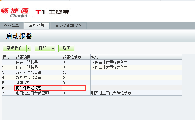 3、根据设定的保质期报警提前天数,以及保质期限,在使用工贸宝软件过程中,当产品即将到期时,软件会在启动报警中显示报警记录数,如图下: