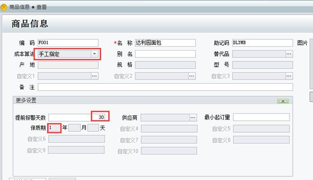 1、首先设置商品信息,成本算法必须是“手工*”,同时录入保质期、提前报警天数,如图下: