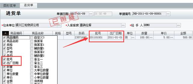 2、供应商送货上门后,录入进货单,调出出厂日期与批号,并录入出厂日期与批号,如图下操作: