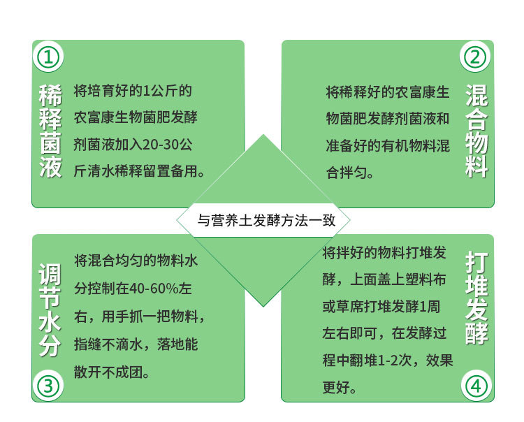 利用农富康生物菌肥发酵剂发酵生产的羊粪有机肥具有以下特点,无害化程度高、改良土壤、利于吸收、缓速增效,增产增收、培肥地力,均衡营养、改善农作物产品品质,提高农作物的产量,对促进我国特色农业的发展起到推动作用。